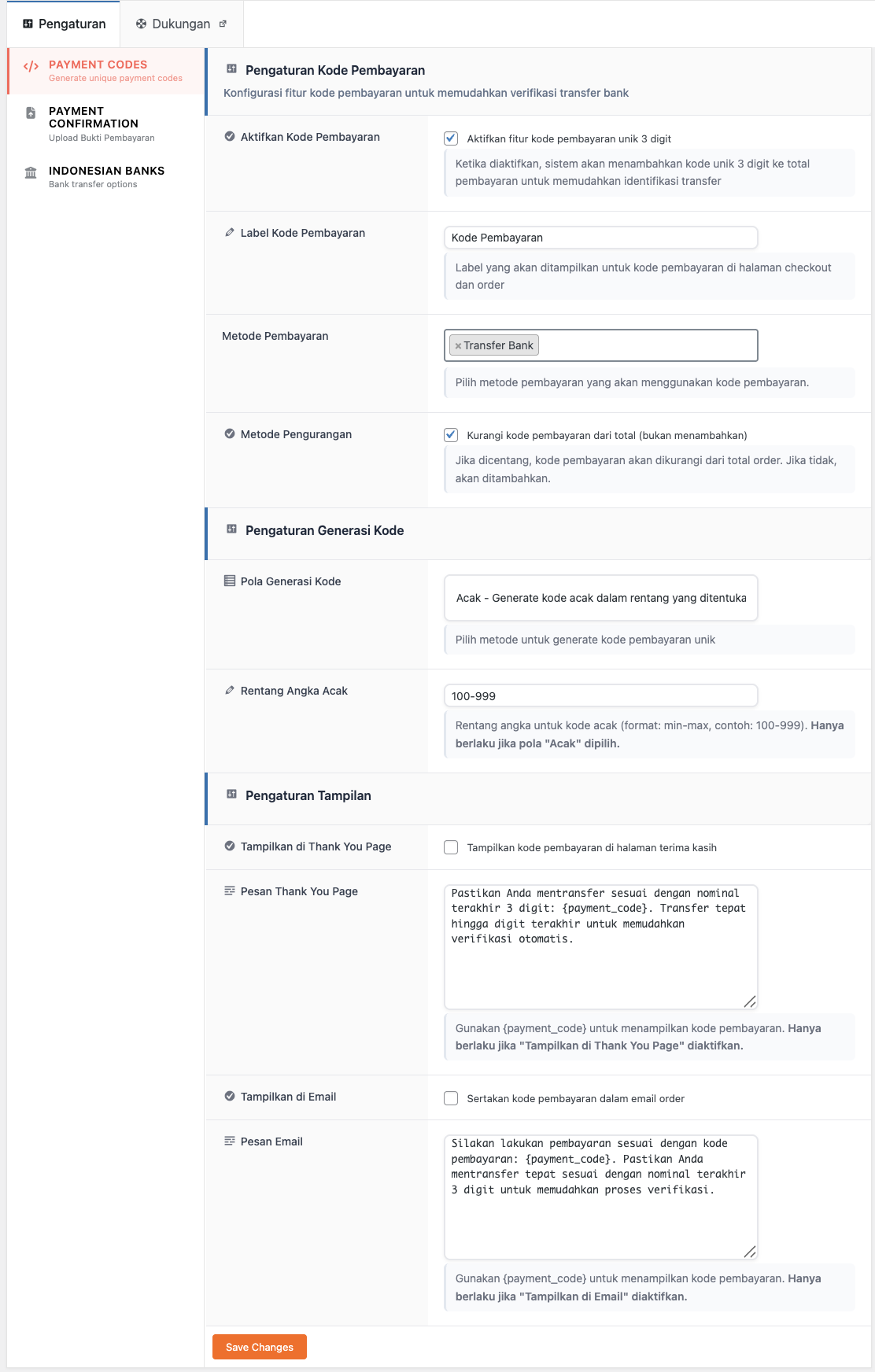| Label Kode Pembayaran | Teks label yang ditampilkan untuk kode pembayaran di halaman checkout dan order (default: “Kode Pembayaran”) |