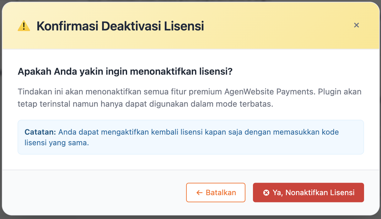 - Konfirmasi dengan mengklik Ya, Nonaktifkan Lisensi pada modal konfirmasi