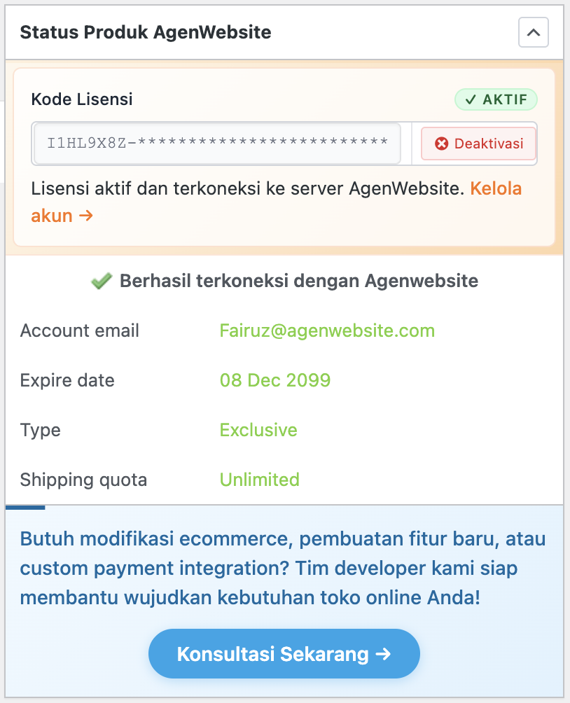 - Periksa kembali kode lisensi dari halaman akun AgenWebsite