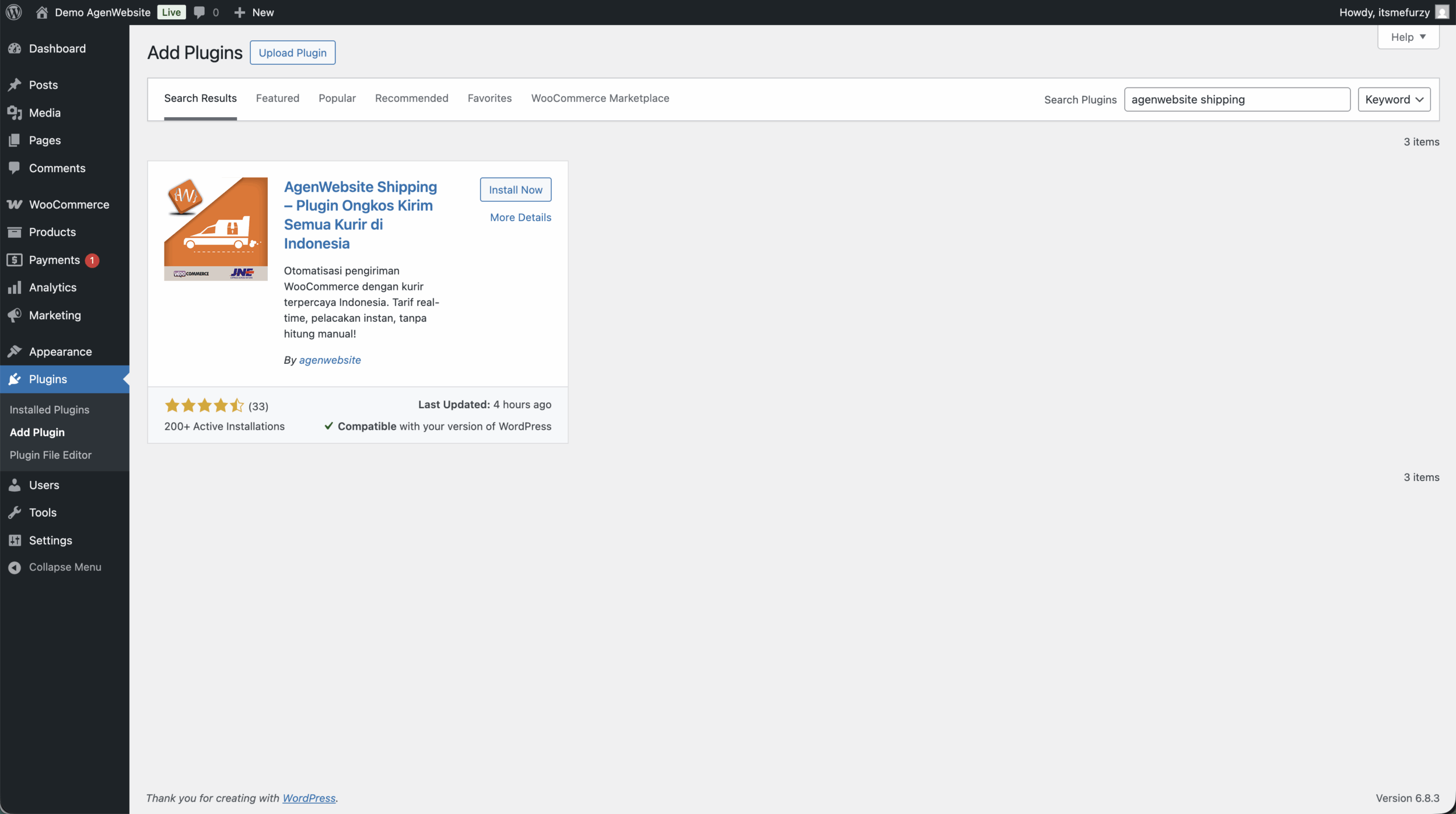 Dashboard WordPress > AgenWebsite Shipping > Pengaturan > CEK ONGKIR TAB