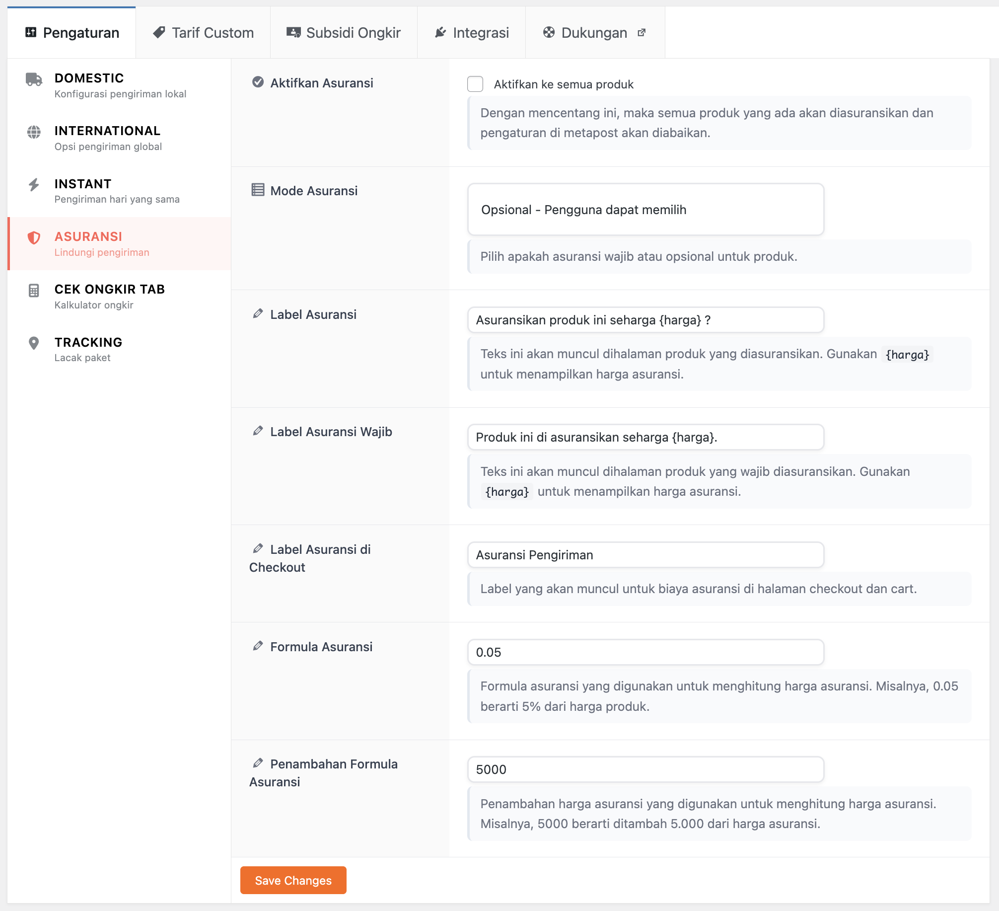 - Catatan: Jika dicentang, semua produk akan diasuransikan dan pengaturan di metapost produk individual akan diabaikan
