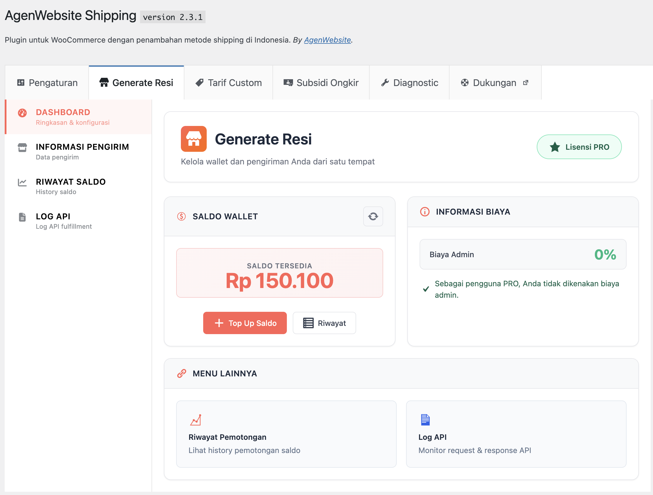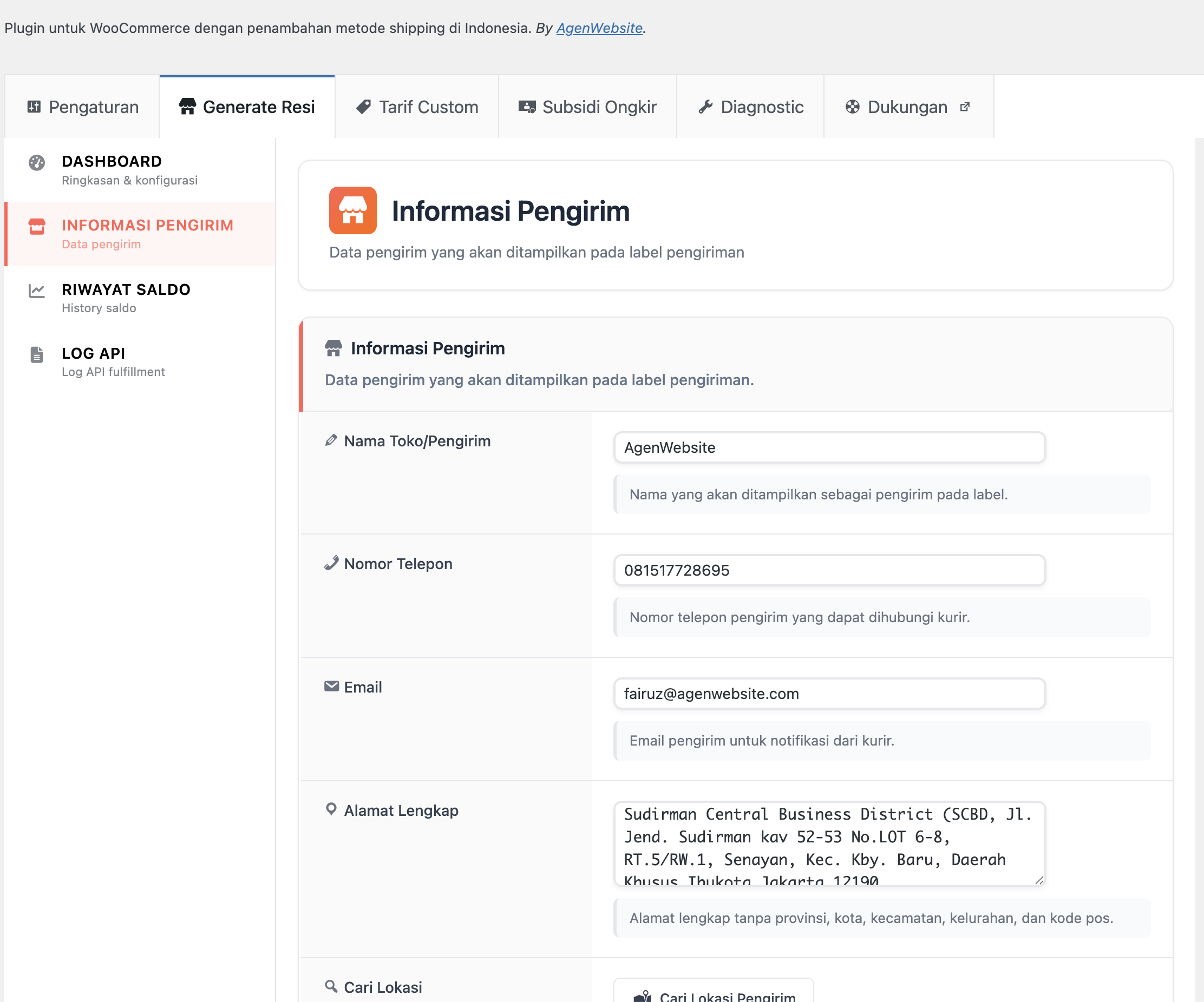 Dashboard WordPress > AgenWebsite Shipping > Pengaturan > DOMESTIC