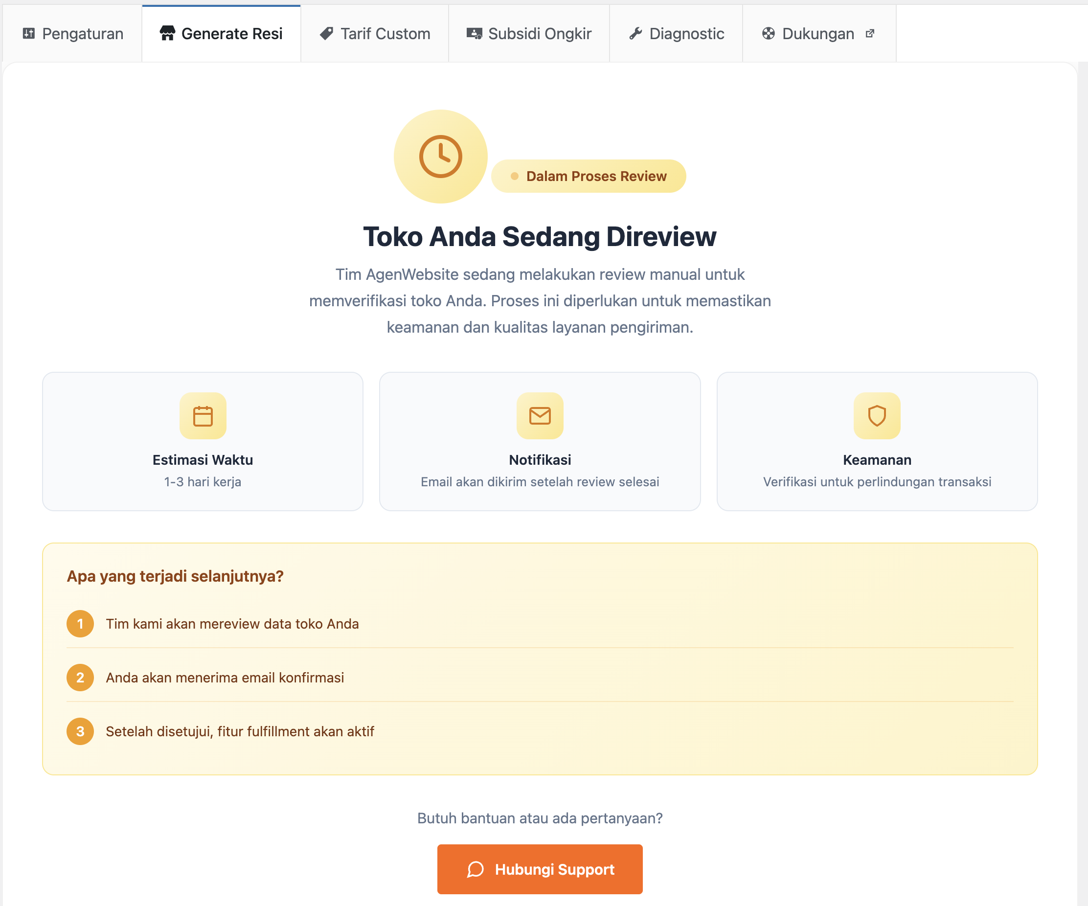 Untuk mengaktifkan fitur resi kami akan menganalisa toko online Anda terlebih dahulu dan pastikan toko online Anda aktif dan tidak menjual barang – barang yang dilarang