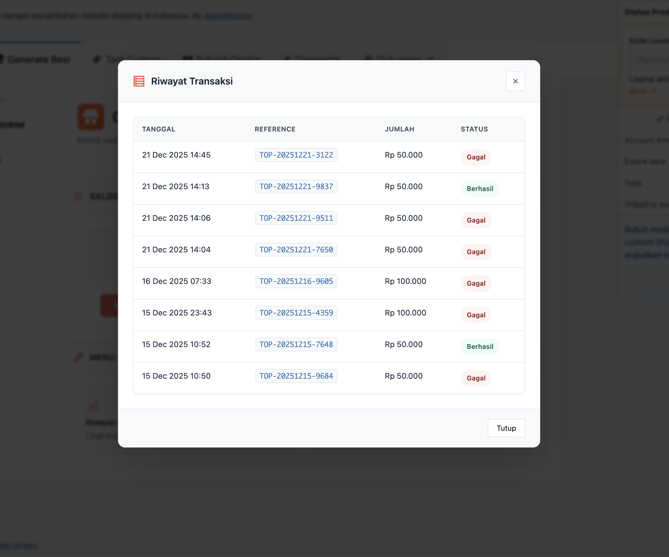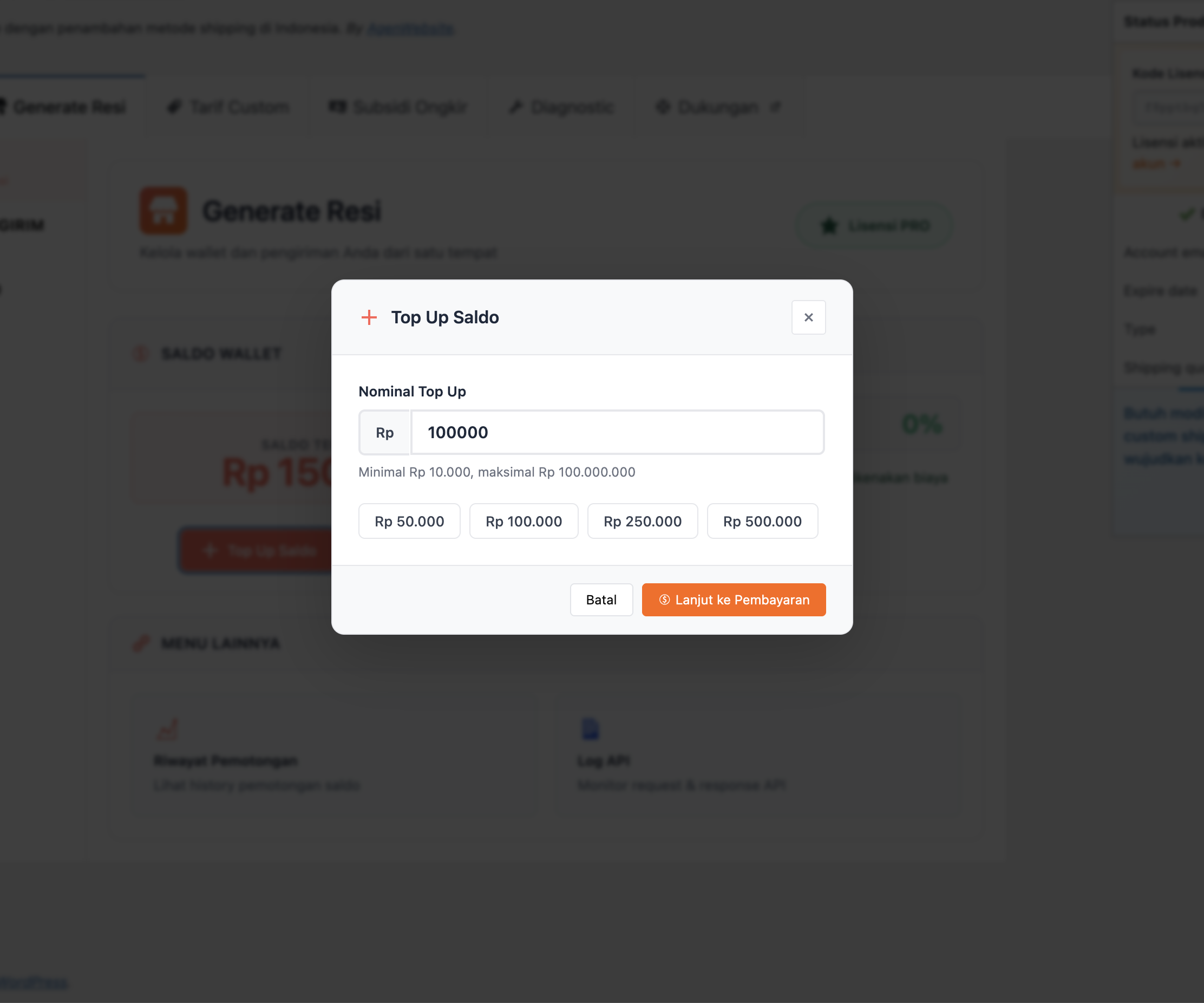Aktivasi lisensi diperlukan untuk mengaktifkan seluruh fitur premium plugin, termasuk pengiriman international, kurir instant, asuransi, tracking, dan fitur-fitur lanjutan lainnya.