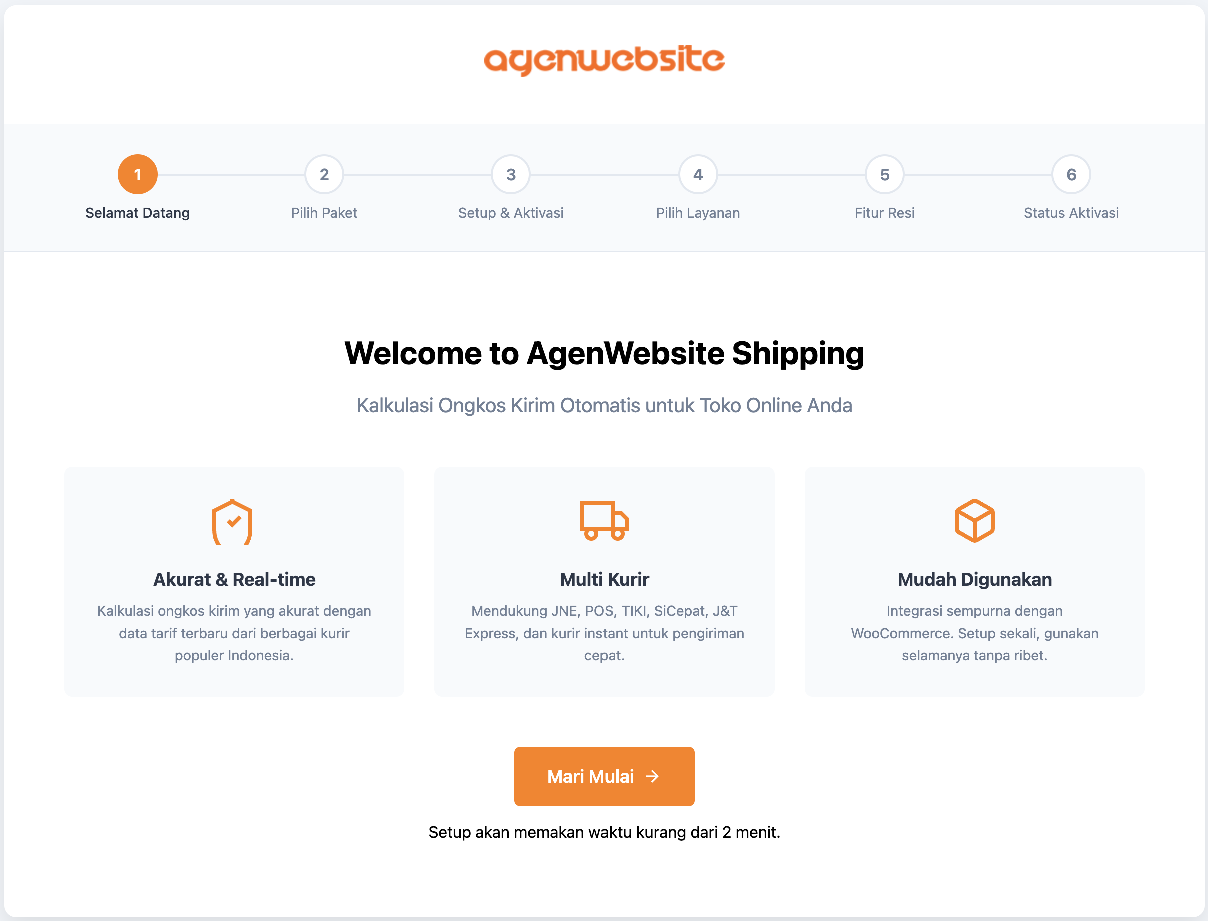 - Setelah plugin diaktifkan, Anda akan diarahkan ke halaman Setup WizardAtau akses manual melalui Menu AgenWebsite Shipping