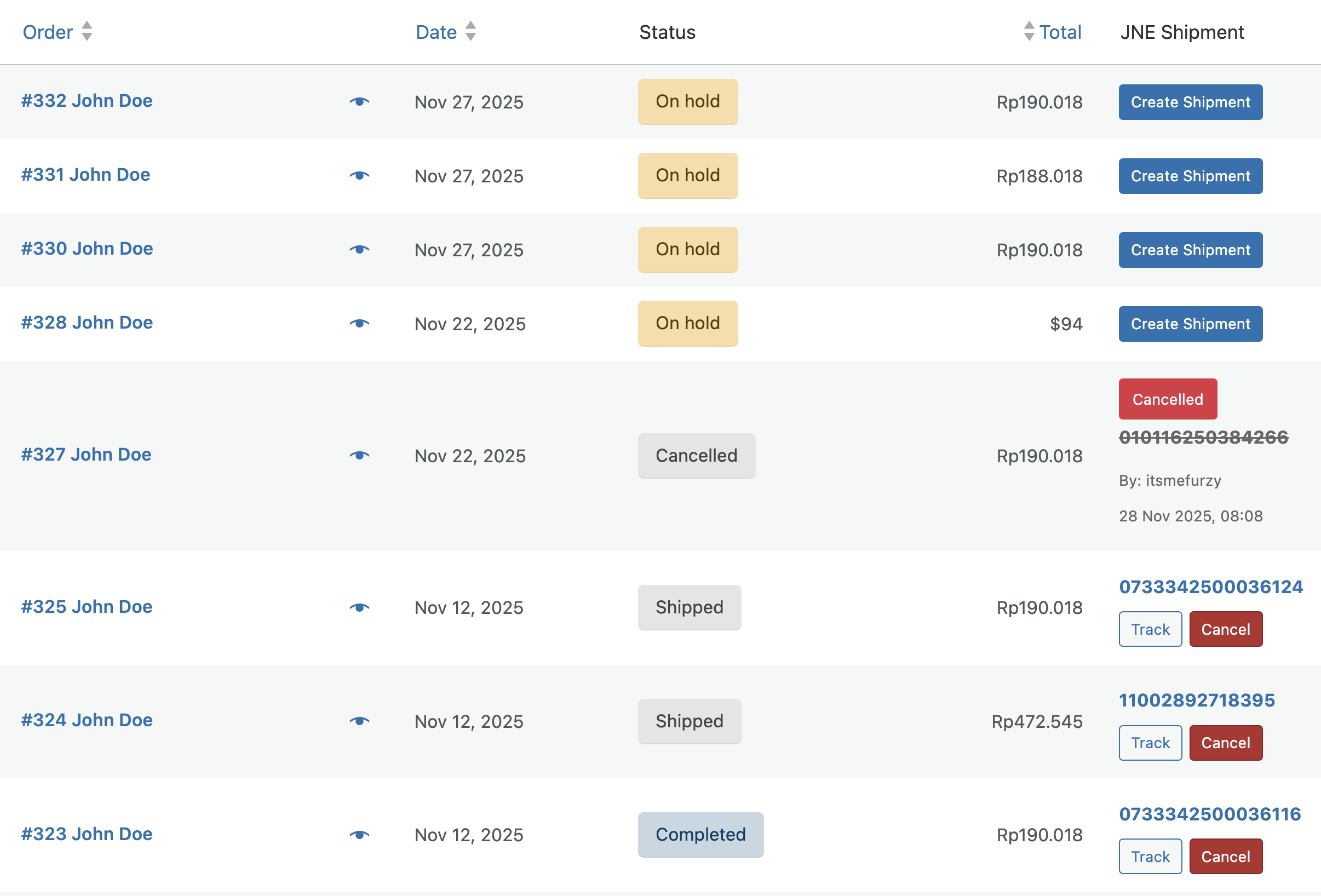 Administrator dapat melihat status pengiriman JNE langsung dari halaman daftar order WooCommerce tanpa perlu membuka detail order satu per satu.