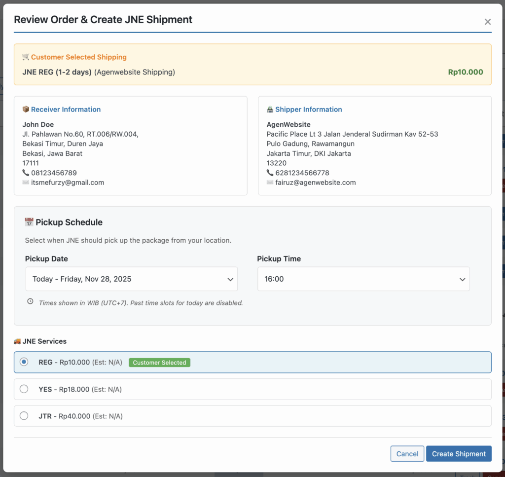 Pembuatan Airwaybill JNE dilakukan secara instant dengan data pengirim dan penerima yang otomatis terisi dari order, memastikan proses pengiriman berjalan cepat dan akurat.