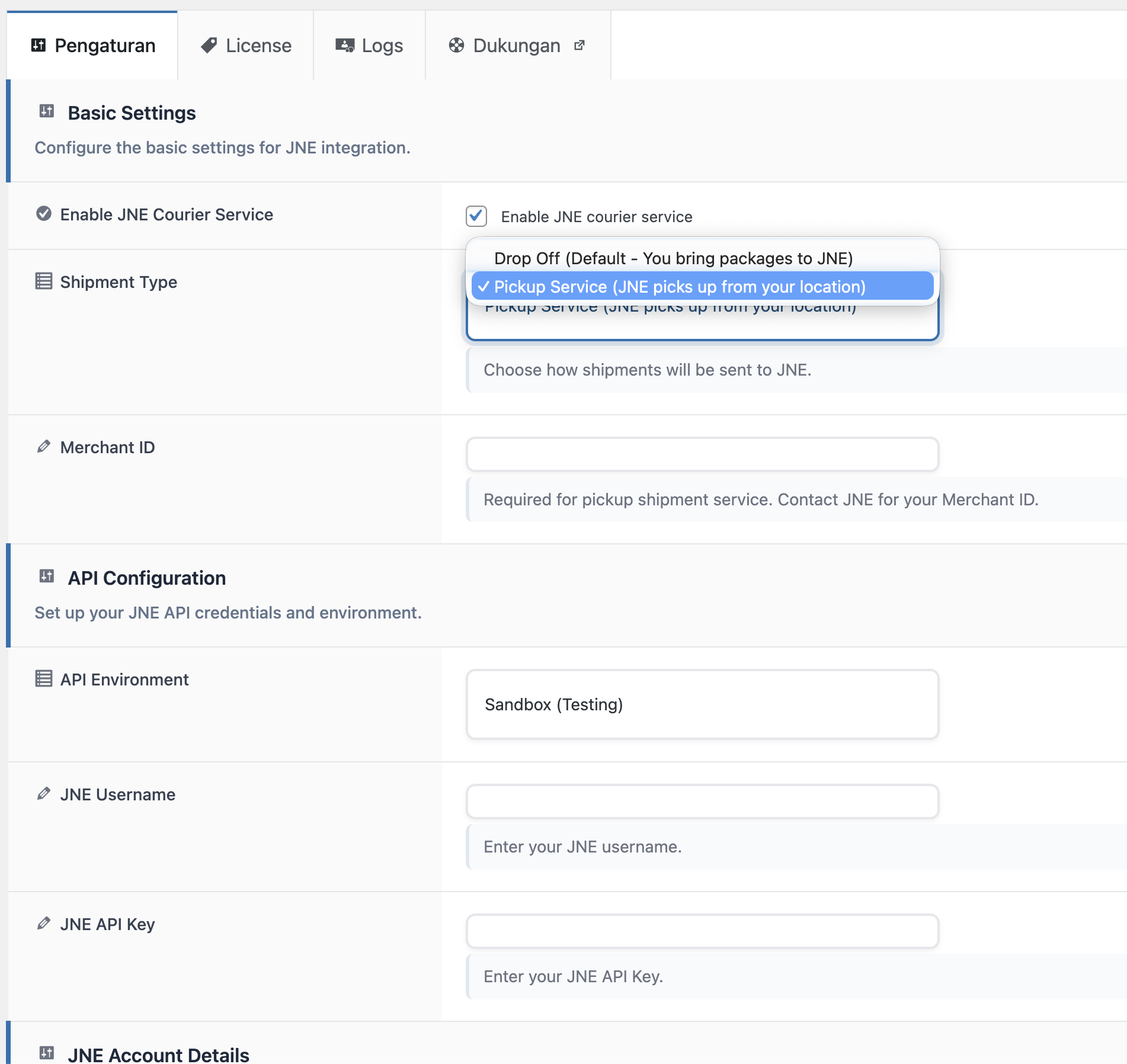 Plugin integrasi resmi untuk menghubungkan toko WooCommerce dengan layanan kurir JNE. Plugin ini menyediakan fitur pengelolaan pengiriman, pelacakan paket, dan otomasi alur kerja untuk operasional toko online Anda.