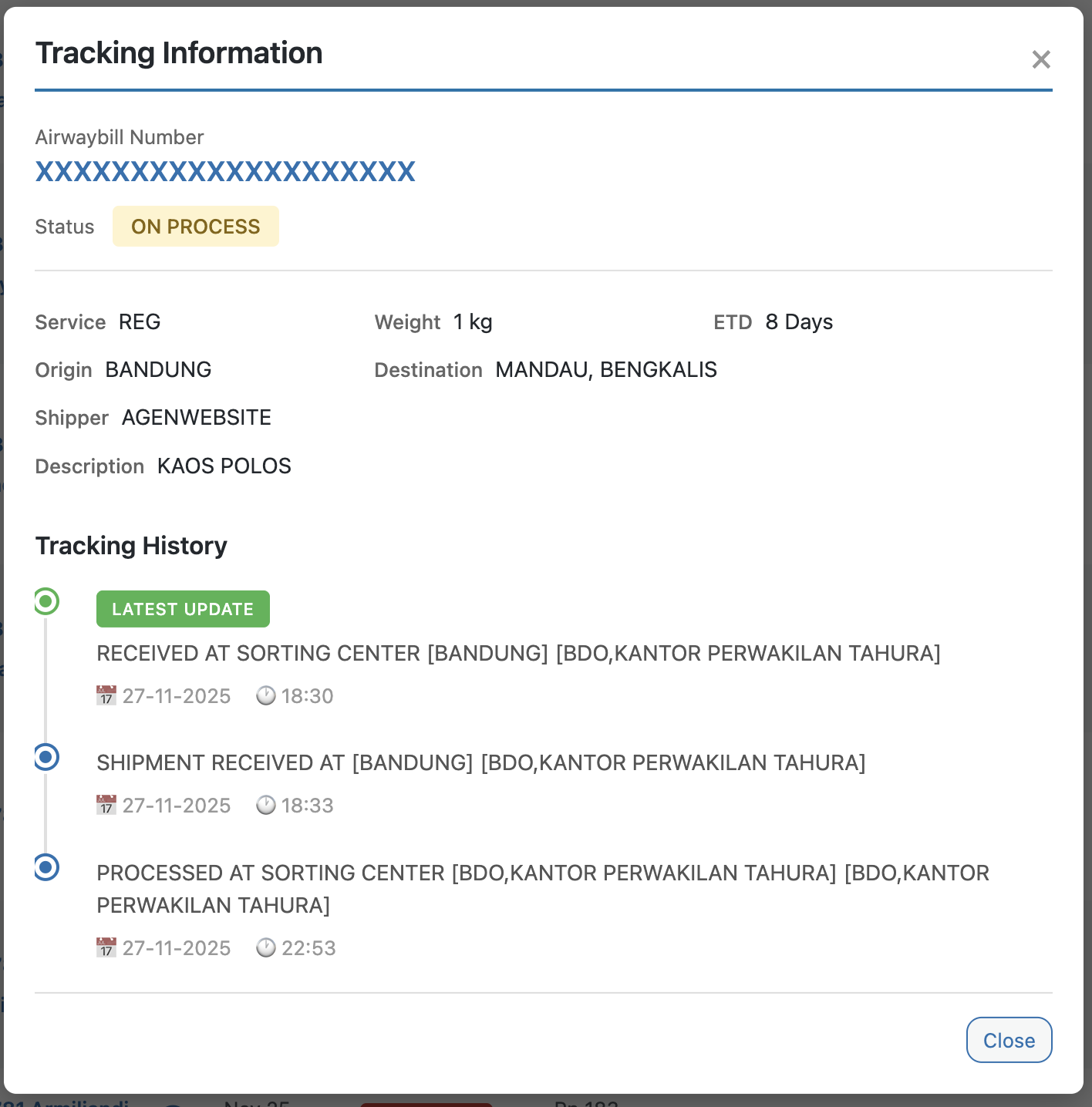 Tracking ini terintegrasi dengan ekspedisi yang dipilih sehingga mengeluarkan data yang realtime dan akurat langsung dari sistem JNE.